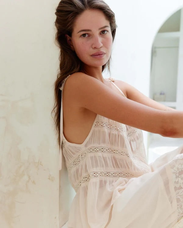 The Zinnia cami in textured chiffon features delicate lace trim.